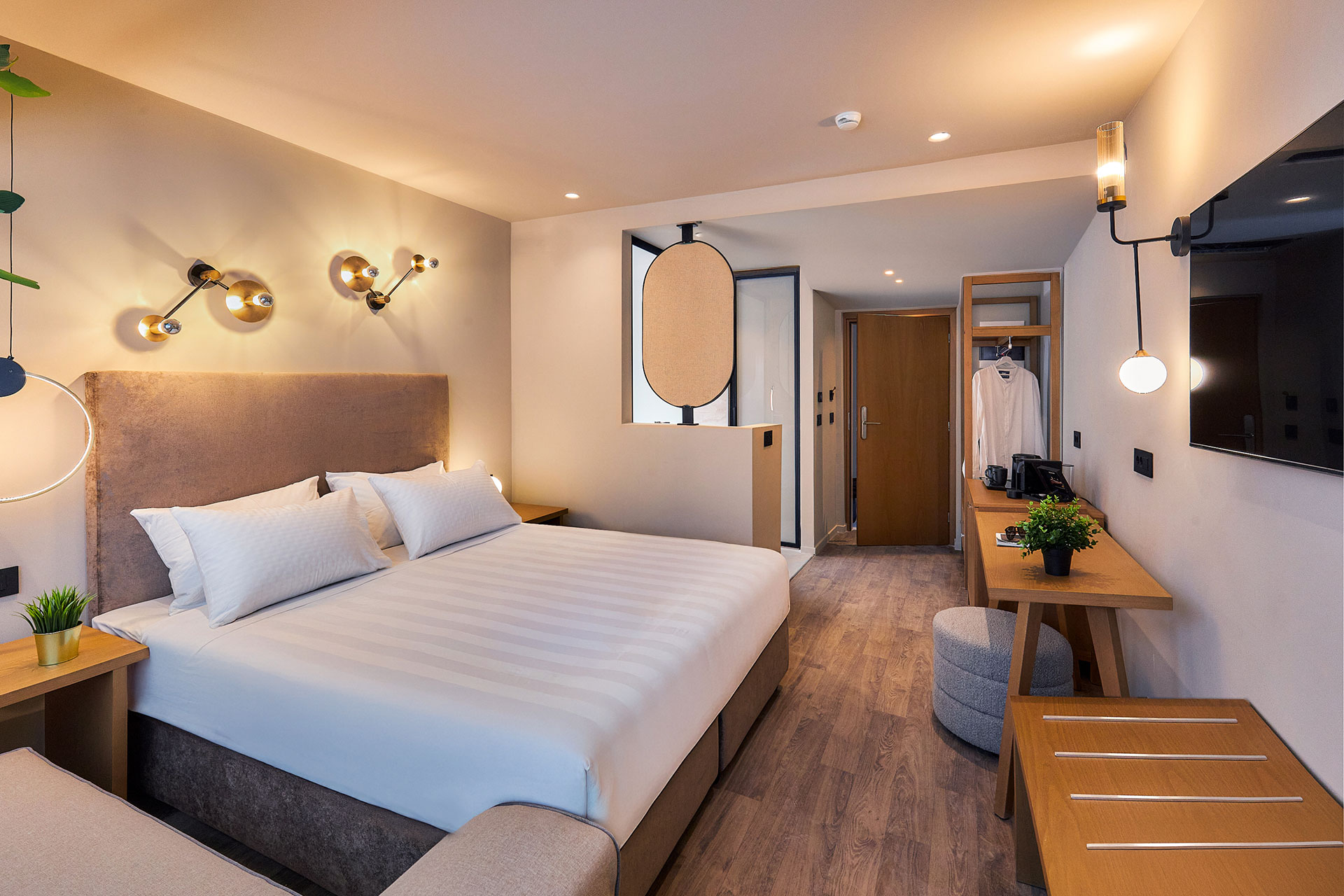 Designed for up to three guests, this room combines a double or twin bed configuration with a cozy sofa bed. The en-suite bathroom features a walk-in shower and premium fittings.